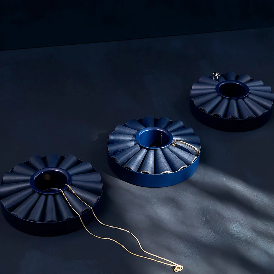 This captivating piece by Turkish designer Bilge Nur Saltik transcends mere practicality. The graceful, petal-like curves of the Bellis Jewelry Holder seamlessly blend artistry and purpose. A looped leather bed and central metal container provide elegant storage for rings, necklaces, and bracelets while preserving aesthetic harmony.