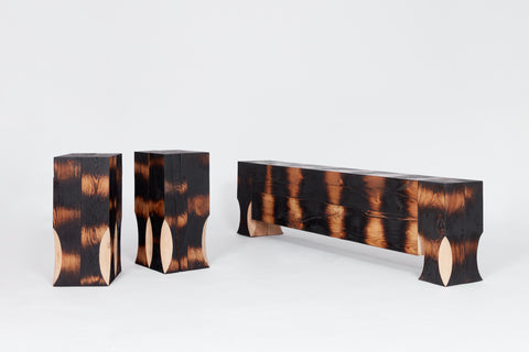 Combining traditional techniques with contemporary design, the Go Shun Stool by Yoon Shun showcases the artist's mastery of working with wood. Solid oak beams are meticulously carved using the ancient practice of wood burning, resulting in an intricate pattern etched into the surface.